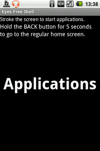 De eerste melding die je op het scherm te zien krijgt, is 'Stroke the screen to start applications'. Tekst is echter niet zo belangrijk, omdat Eyes-Free Shell je bij elke aanraking vertelt wat er gebeurt. Veeg bijvoorbeeld met je vinger naar rechts en je toestel leest jouw geografische locatie voor. Veeg naar onderen om een nieuw menu met geïnstalleerde apps te openen. In dit menu houd je je vinger op het scherm om op alfabetische wijze te bladeren door je programma's.